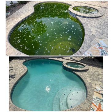 Our Green-to-Clean service is a step-by-step process designed to safely eliminate algae, restore clear water, and rebalance your pool’s chemistry. Most treatments are completed in 3 to 5 visits over 1 to 2 weeks, depending on the condition of your pool and its response to treatment.